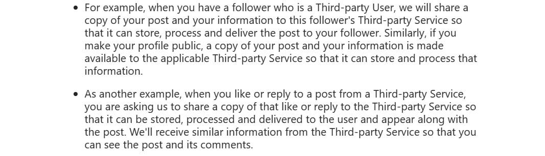 থ্রেডগুলি তার গোপনীয়তা নীতিতে বলেছে যে ডেটা — পোস্ট, পছন্দ এবং জবাবের মতো — প্রকাশ্যে এবং তৃতীয় পক্ষের পরিষেবাগুলির সাথে ভাগ করা হয়েছে.